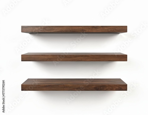 Three dark wood floating shelves hang on white wall. Empty shelves are arranged vertically, providing ample space for product placement or decor. This minimalist furniture offers clean background.