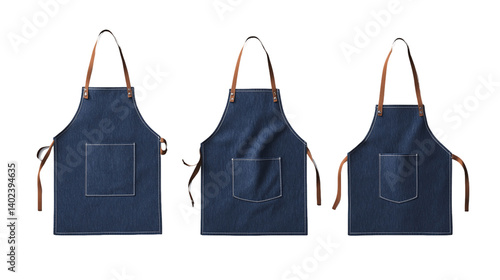 apron, denim, blue, leather, brown, pocket, strap, cooking, kitchen, workwear, fashion, style, accessory, clothing, textile, fabric, hand-made, craft, vintage, retro, rustic, industrial, casual attire, uniform, tool, equipment, protection, wear, apparel, attire, garment, outfit, three, set, collection, different, size, dark, indigo, shades, transparent, background, isolated, object, item, product, design, illustration