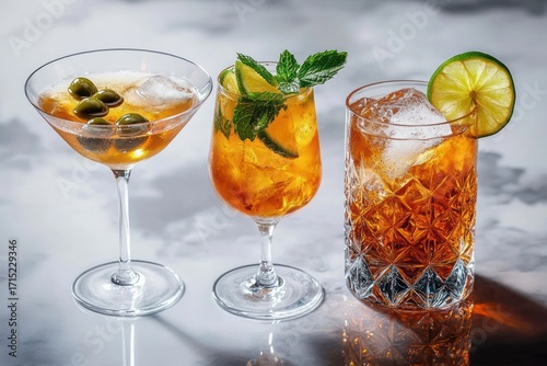 Three different cocktails on a marble surface with garnishes including olives, lime wedge, and fresh mint leaves under soft natural light