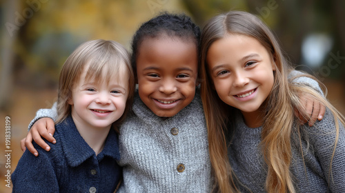 Three diverse faceless children including boy with Down syndrome smiling and hugging in park, happy friends showing inclusion and childhood friendship, with copy space