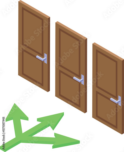 Three doors and three green arrows showing different directions representing choice, opportunity, solution and decision making