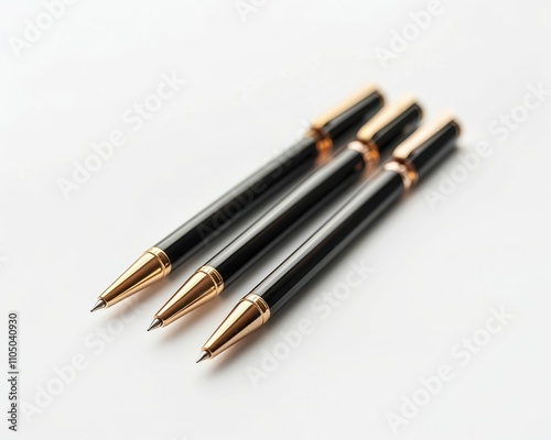 Three elegant black pens with gold accents are arranged neatly on a white background, emphasizing their sleek design and professional appearance.