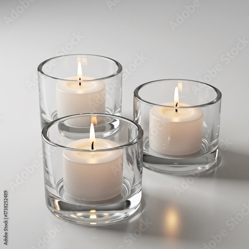 Three elegant white pillar candles glow softly within clear glass votive holders, creating a serene and calming ambiance perfect for relaxation and mindfulness.