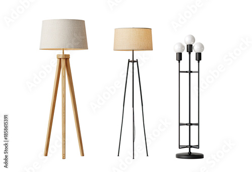 Three floor lamps in neutral tones. Two have light beige shades, wooden tripod bases. One has a black metal base, multiple light globes