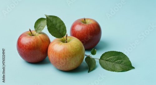 Three Fresh Red Apples With Green Leaves On A Teal Blue Background With Soft Lighting