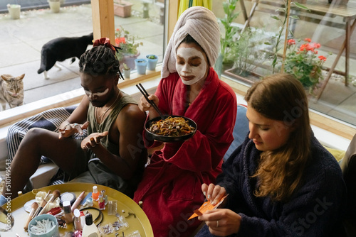 activity, afro, animal, beauty product, candid, cat, chinese, chopstick, colours, corner, cream, eat, enjoy, equipment, ethnicity, eat, floor, food, friends, fun, furniture, hair, happy, home, indoor, lifestyle, make up, nail polish, noodle, object, ponytail, portrait, product, real people, red, relax, share, to sit, smile, table, together, towel, yellow, youth