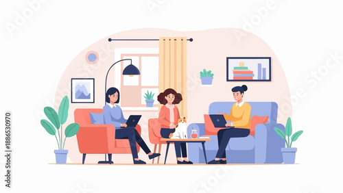 friends, work, laptop, living, room, cosy, cat, home, interior, people, woman, casual attire, comfortable, furniture, sofa, armchair, table, lamp, window, curtain, plant, decor, modern, illustration, flat, design, digital, art, scene, relaxed, lifestyle, creative, collaboration, freelance, remote, study, learning, technology, connection, together, companionship, pet, drink, leisure, apartment, domestic, ambience, friendly