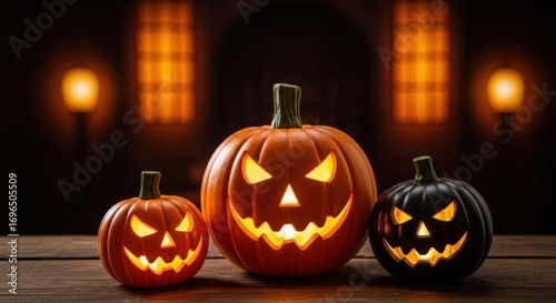 Three glowing jack o lanterns on a wooden table for halloween night