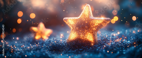 three glowing stars on a blue glitter background,