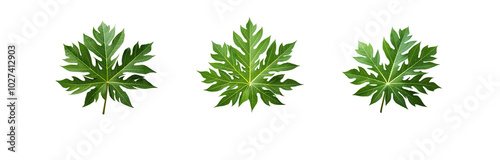 Three green papaya leaves are isolated against a white background.