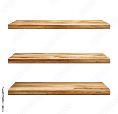 Three horizontal wooden shelves. Image shows light brown wooden shelves, rectangular shape, stacked vertically. Natural wood grain visible. Simple, clean design