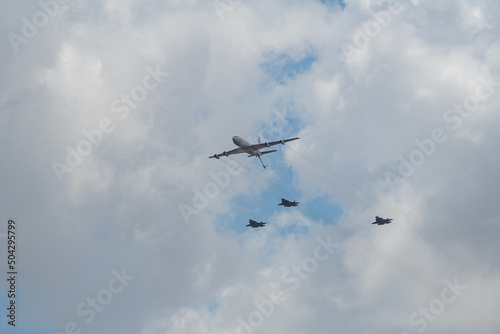 Three Israeli Stealth Fighter Jets Flying in Formation together with a Refueling Jumbo Jet in the air parade as part of Israel's Independence Day Celebrations