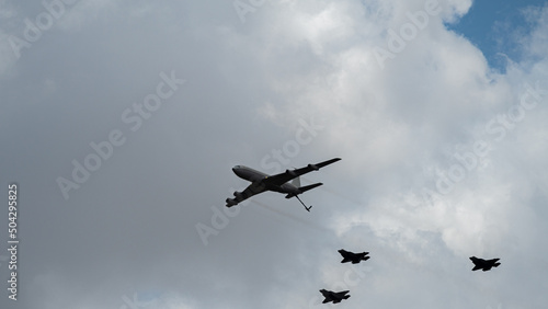 Three Israeli Stealth Fighter Jets Flying in Formation together with a Refueling Jumbo Jet in the air parade as part of Israel's Independence Day Celebrations