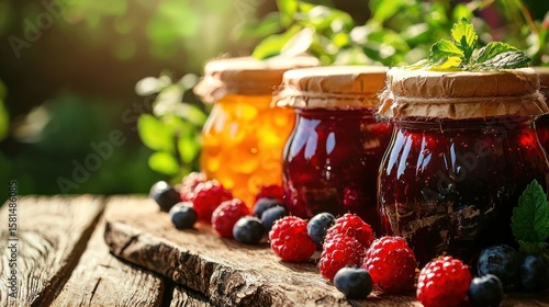 jam, jar, three, jar, colourful, wooden, table, fresh, berry