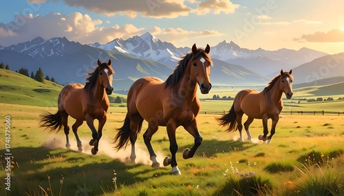 Three majestic horses gallop across a sun-drenched meadow, their manes flowing in the gentle breeze, set against a backdrop of snow-capped mountains.