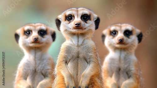 Three meerkats sitting together, alert in a blurred savannah background; wildlife photo for calendars, websites