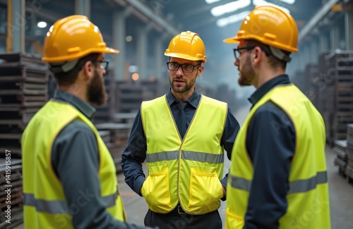 Three men in safety vests, hard hats discuss plans in steel factory. Supervisor explains instructions to workers. Industry job, teamwork, safety at workplace, steel production, industrial interior.