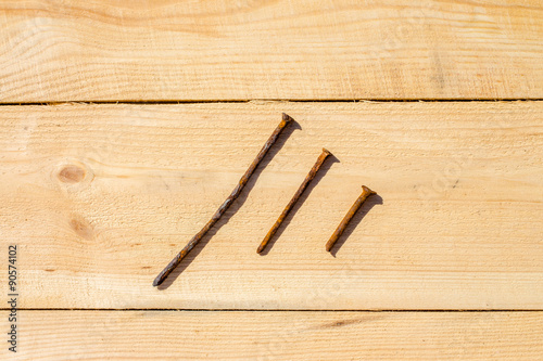 Three nails on a wooden table