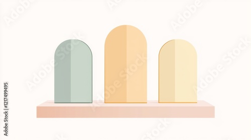 Three panels with arched tops in soft pastel colors of green, peach, and cream are displayed on a pink pedestal, offering a stylish and modern presentation space
