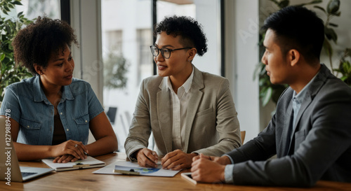 people, sitting, table, discussing, business, attire, meeting, woman, wearing, office, goggles, laptop, paper, group, teamwork, businesswoman, professional, colleague, working, team, corporate, communication, businessman, adult, young, cooperation, manager, workplace, executive, employee, talk, technology, leadership, female, planning, project, boardroom, brainstorming, diverse, caucasian, room, leader, indoor, paperwork, listen, strategy, conference, company