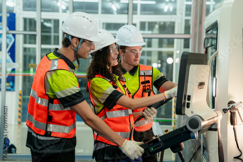 Three people wearing safety gear are working on a computer. Concept of Industry 4.0 with diverse engineers collaborating on automation technology.