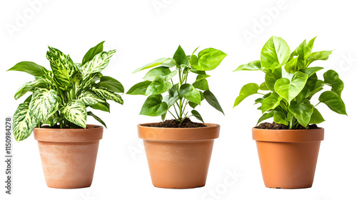 Three Potted Plants in Terra Cotta Pots, Isolated on Black, Showcasing Varied Leaf Patterns and Textures, Perfect for Botanical or Nature-Themed Designs