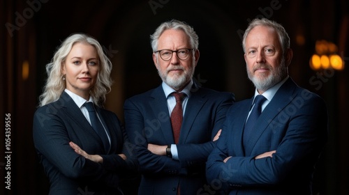 Three professionals stand closely together in formal attire, exuding confidence and authority in a business environment. The ambient lighting highlights their expressions and partnership