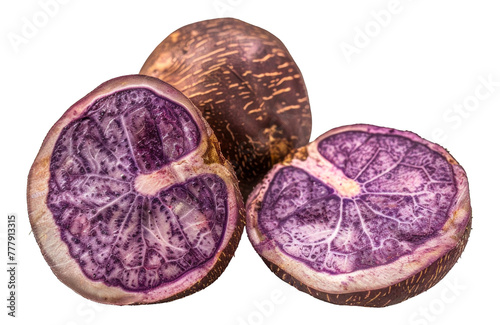 Three purple fruits are cut in half, revealing their purple insides, cut out - stock png.