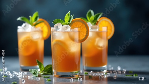 Three refreshing iced tea cocktails garnished with orange slices and mint
