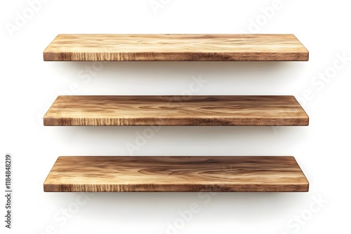 Three rustic wooden shelves on white wall, product display