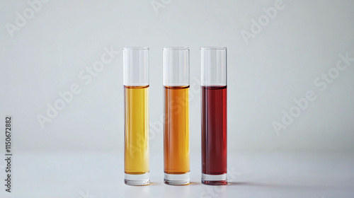 Three small flask glass tubes of different liquid colors isolated. scientific experiment glassware equipment, chemical or medical laboratory research test, container, white, instrument.