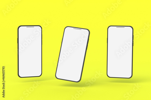 Three smartphones with isolated white screen on yellow background. 3d render