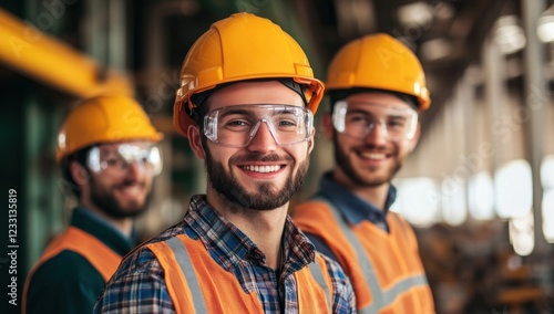Three smiling construction workers wearing hard hats and safety glasses, industrial setting, teamwork, safety, professionalism
