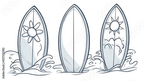 surfboard, water, wave, ocean, stylised, graphic, illustration, line, art, drawing, vignetting, design, summer, beach, vacation, surfing, sport, aquatic, activity, fun, relaxation, leisure, outline, white, black, wave, splash, floral, sun, flower, cartoon, simple, holiday