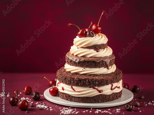 Three tier chocolate cake with fresh cherries on a rich burgundy background, confectionery, celebration, three tier