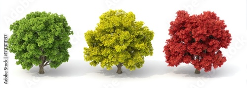 Three trees in different seasons, showing vibrant green, yellow, and red foliage against a white background