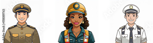 Three uniformed professionals: a soldier, a construction worker, and a security guard. Diverse characters in illustrated style.