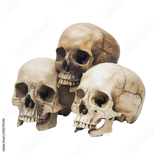Three white skulls display intricate details and textures in a close arrangement on a light background, group three skulls sitting next to each other, white background