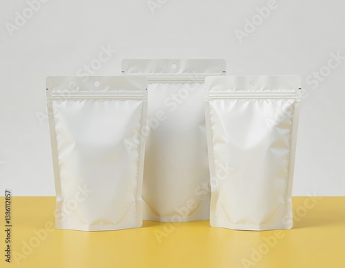 Three White Stand-up Pouches for Packaging Product on Yellow Background