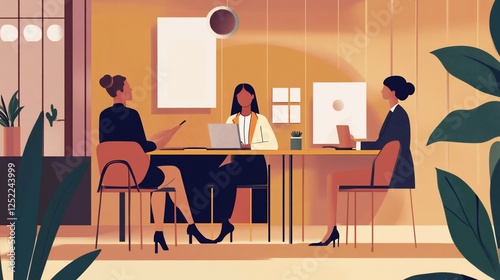 office, woman, desk, laptop, plant, working, business, meeting, interior, design, workplace, colleague, teamwork, collaboration, furniture, modern, professional, illustration, people, sitting, attire, conference, table, communication, corporate, minimal, geometric, graphic, style, light, indoor, workspace, activity, technology, contemporary, female, men at work, personnel, job, employment