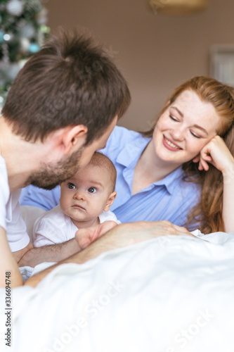 Three-month-old baby in the arms of happy young parents. The most touching moments with father and mother