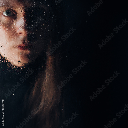 woman, portrait, black, face, young, beautiful, beauty, dark, hair, window, fashion, rain, people, night, model, glasses, eye, person, sad, brunette, eye, art, look, wet, halloween