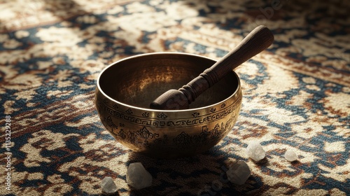 Tibetan singing bowl with intricate carvings, set on an ornate carpet with scattered crystals, creating a serene and spiritual atmosphere, perfect for meditation and relaxation themes.. AI Generation