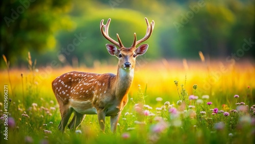 Tilt-Shift Photography of a Majestic Male Axis Deer in Lush Landscape