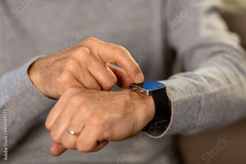man, senior, old, wristwatch, hand, time, home, people, wearable, contraption, app, application, smart, watch, age, person, lifestyle, leisure, elderly, grandfather, indoor, mature, aged, concept, male, punctuality, hours, ageing, adult, closeup, copy space, copy space, blank, human, body part