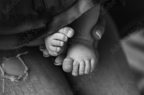 Tiny baby feet of the firstborn in the loving arms of a young mother