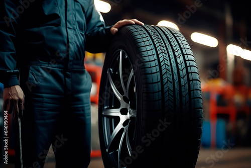tire at repairing service garage background. Technician man replacing winter and summer tire for safety road trip. Transportation and automotive maintenance concept.