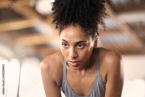Tired, fitness and woman after a gym sport, workout and training exercise run in a wellness club. Breathe recovery of an athlete sweating from sports, running cardio and strong runner jog for health