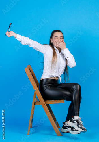 sitting, chair, yawning, posture, covering, mouth, sleepy, sleepy, exhausted, closed, eye, holding, goggles, crossed, leg, posing, stylish, woman, girl, hand, young, beautiful, adult, female, outfit, white, shirt, black, leggings, sneaker, brunette, caucasian, long, hair, wooden, isolated, blue, studio, background, copy, space, indoor