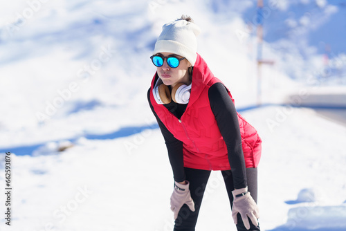 woman, rest, runner, break, sport, nature, winter, snow, breath, mountain, relax, warm clothes, run, sleepy, sportswoman, recovery, activity, young, recreation, training, female, active, cold, athlete, jog, tranquil, alone, frost, season, wellness, practice, vitality, energy, fitness, sunlight, healthy, physical exercise, activewear, serene, motivation, sunglasses, determine, calm, winterly, weather